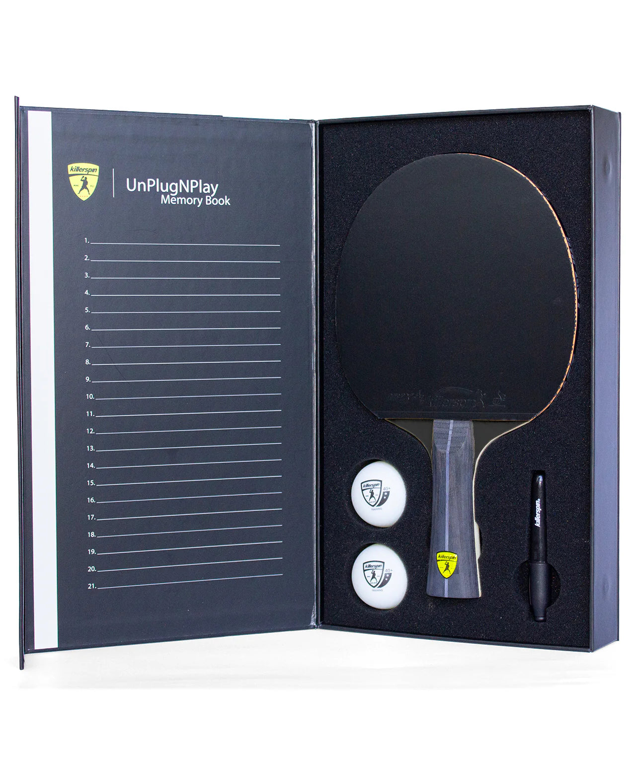 Each Impact D5 Paddle comes in the Killerspin Memory Book Case, designed to protect and elegantly showcase your paddle. This stylish case also provides space to preserve personal memories, such as match scores and player signatures. This makes every game a part of your unique story. It’s perfect as a gift or as a personal keepsakeThis box also comes with two ping pong balls.