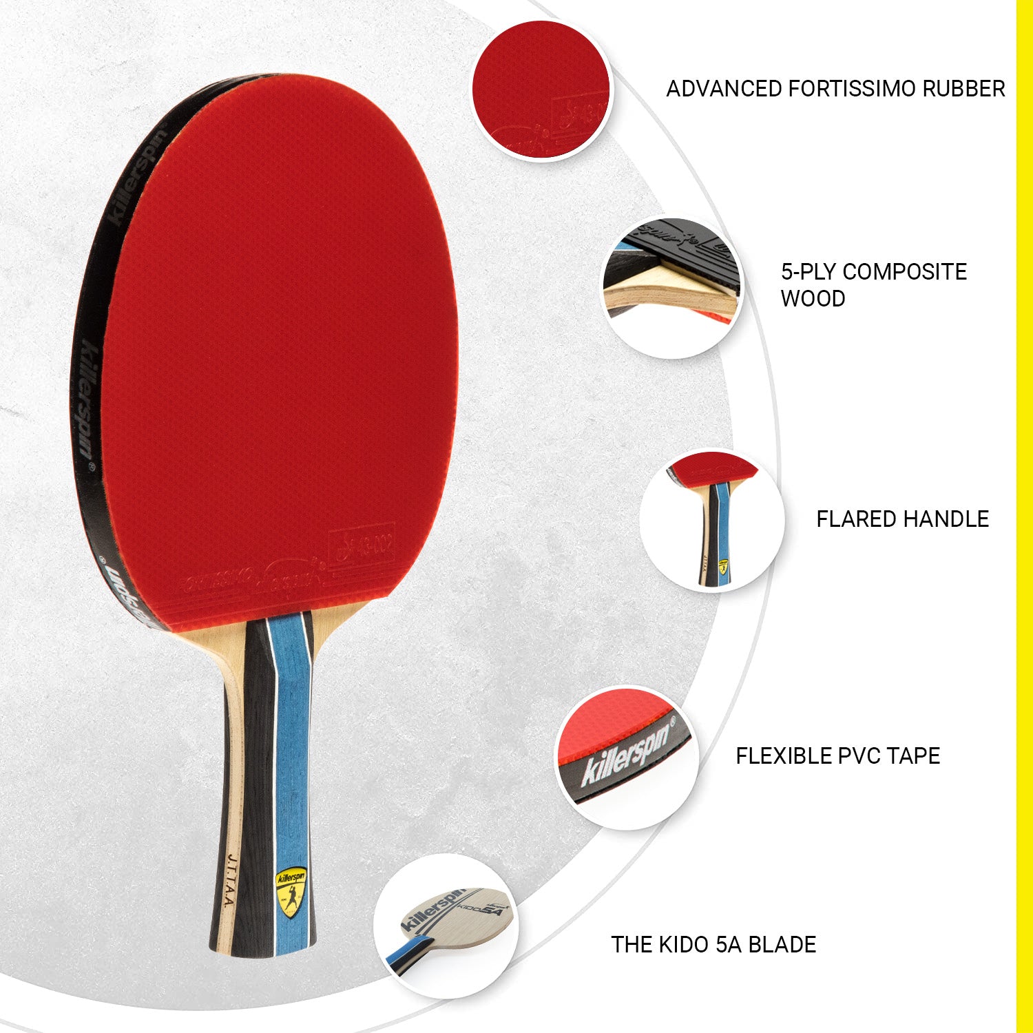The Kido 5A RTG Premium ping pong paddle is engineered to unleash unparalleled spin for advanced competitors, utilizing top-tier Fortissimo Rubber. Elevate your game and dominate the competition with this high-performance table tennis paddle.