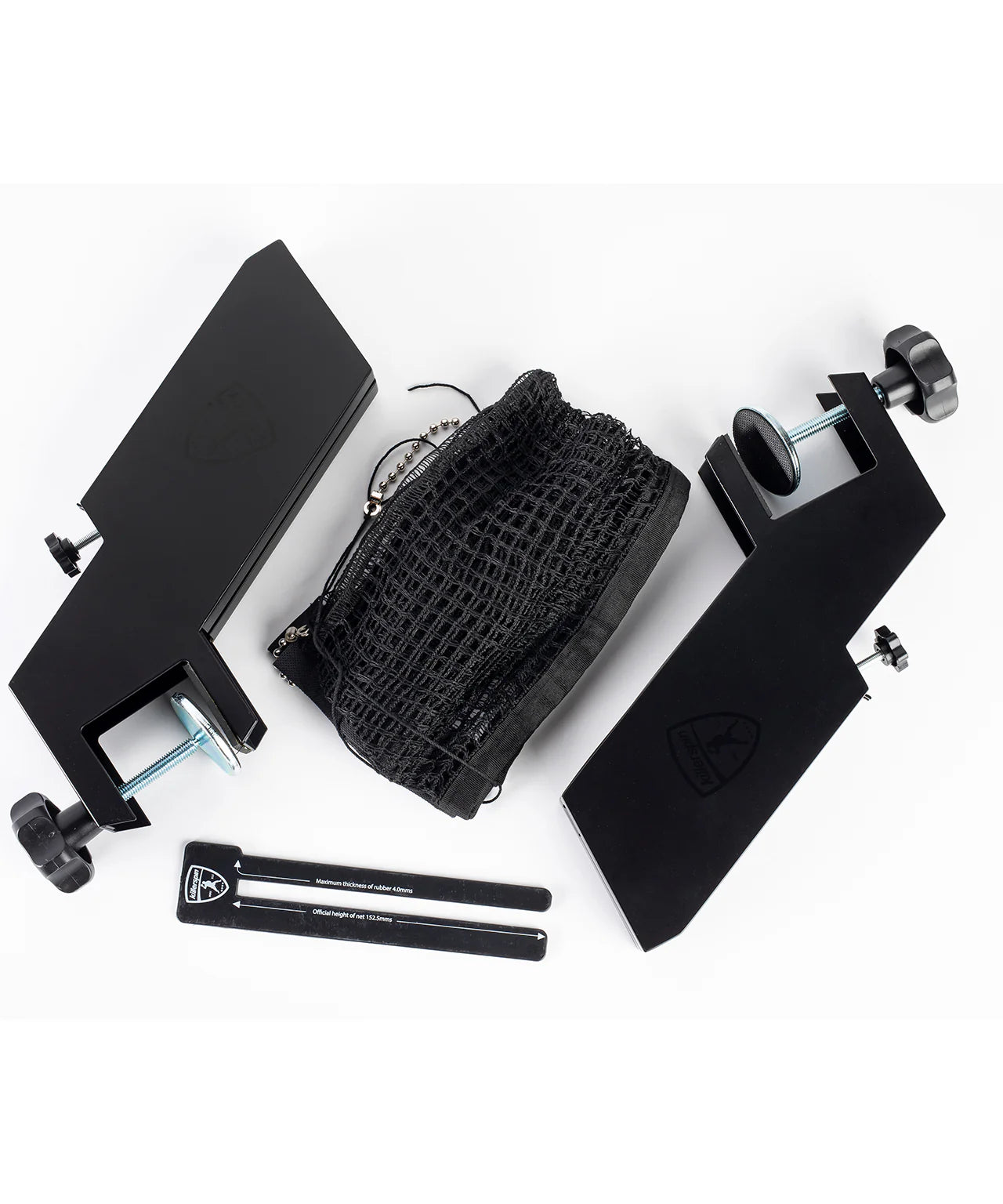 Designed for easy use, the SVR Wing Net Set features a streamlined assembly process, including a single metal rod for quick installation. Its precision tension adjustment system, equipped with an integrated chain mechanism, ensures perfect net tension every time. A measuring gauge is included for accurate height adjustment, while the steel side posts feature screw tighteners and rubber mounting pads that provide secure placement without damaging the table surface.